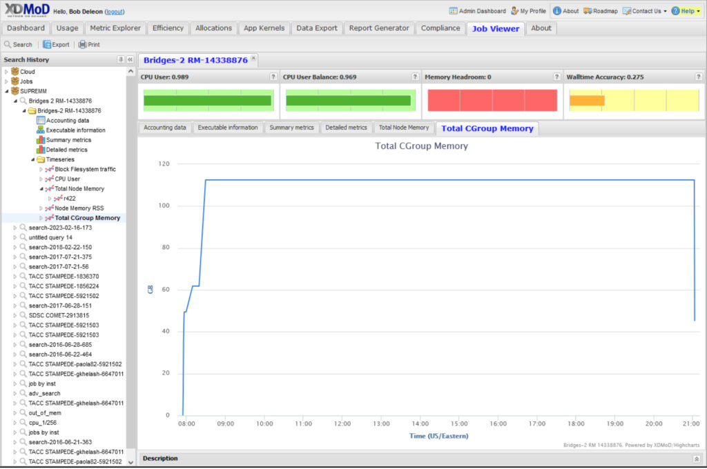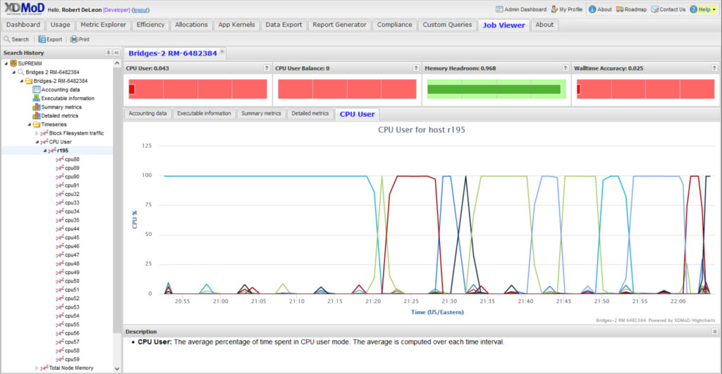There are a number of ways researchers utilizing ACCESS resources can leverage XDMoD to better understand the performance of the jobs they’re running, and in so doing, possibly improve the performance of subsequent jobs. For example, ACCESS users can view detailed job-level performance data for every job through XDMoD’s “Job Viewer” capability.