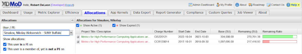 XDMoD makes it simple for users and PIs to track their ACCESS allocation usage. Just log on to ACCESS XDMoD, click on the “Allocations” tab to see all of your allocations, how much has been used and how much is remaining.