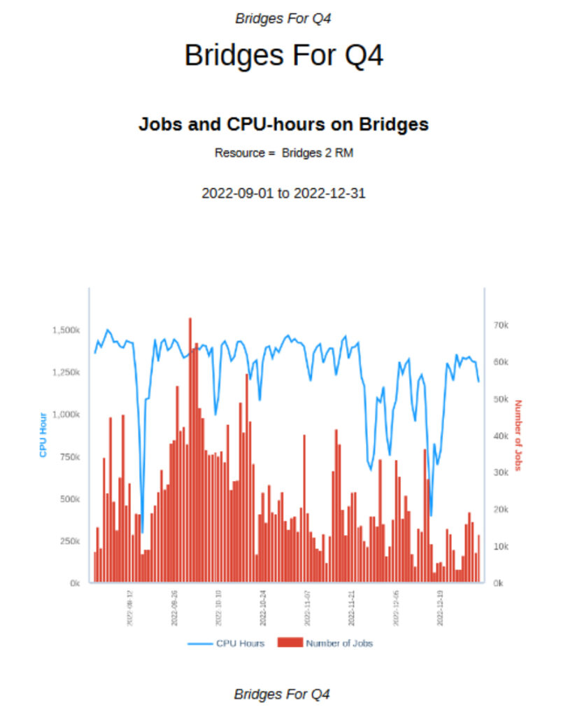 In addition, once a given set of metrics of interest to a particular stakeholder is determined, XDMoD has a report generator feature that can be used to send one-time or periodic reports to that stakeholder, whether they are a researcher, staff support specialist, center director or an NSF program manager. For example, see the illustration below, which shows the first page of a report generated on the utilization of Bridges over the last quarter of 2022. Any metric available in XDMoD can be incorporated into a report and sent one-time or automatically updated and sent daily, weekly, monthly, quarterly, semi-annually or annually.
